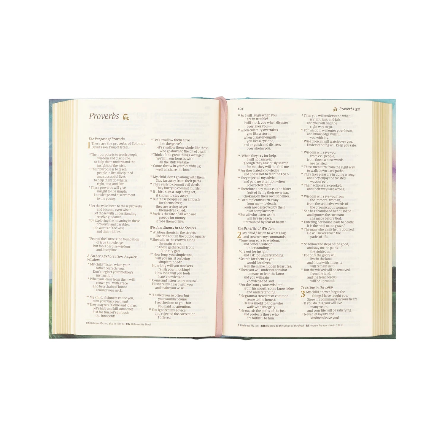 This beautiful NLT Compact Bible features hand-painted artwork inspired by the rolling prairies of the western United States. Its front cover displays “The Holy Bible,” in gold-foiling letters while the back features the phrase “The well that won’t run dry,” referencing Isaiah 58:11. The peaceful imagery of a flowing stream reminds us that even when everything around us feels dry, we have a constant source of life through God’s Word. May the words within these pages nourish you spiritually, filling your heart with the truth and life of the Gospel.