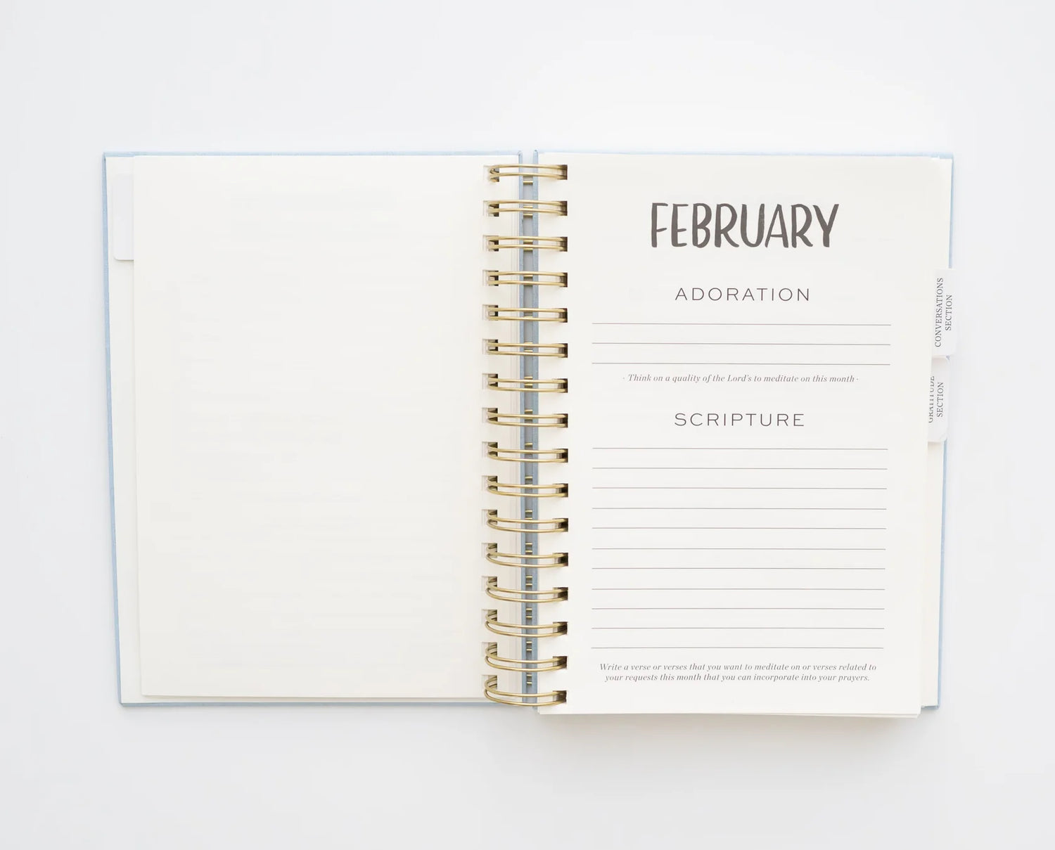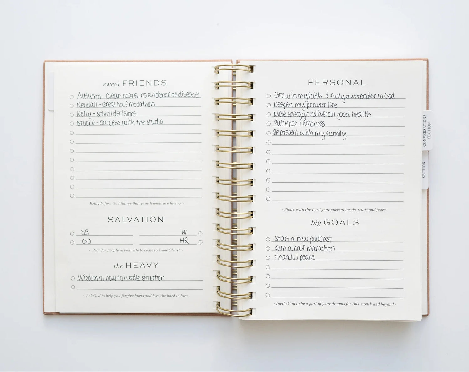 - Monthly Prompts - This section is divided into 12 months with various prompts to organize your prayer requests for Our World & Nation, My Community, My Church, My Loves, My Family, Sweet Friends, Salvation, The Heavy, Personal, Big Goals and three blank sections to customize yourself. Each month, there is also a section for keeping track of answered prayers, adoration, scripture, and a challenge or goal to make prayer a habit.