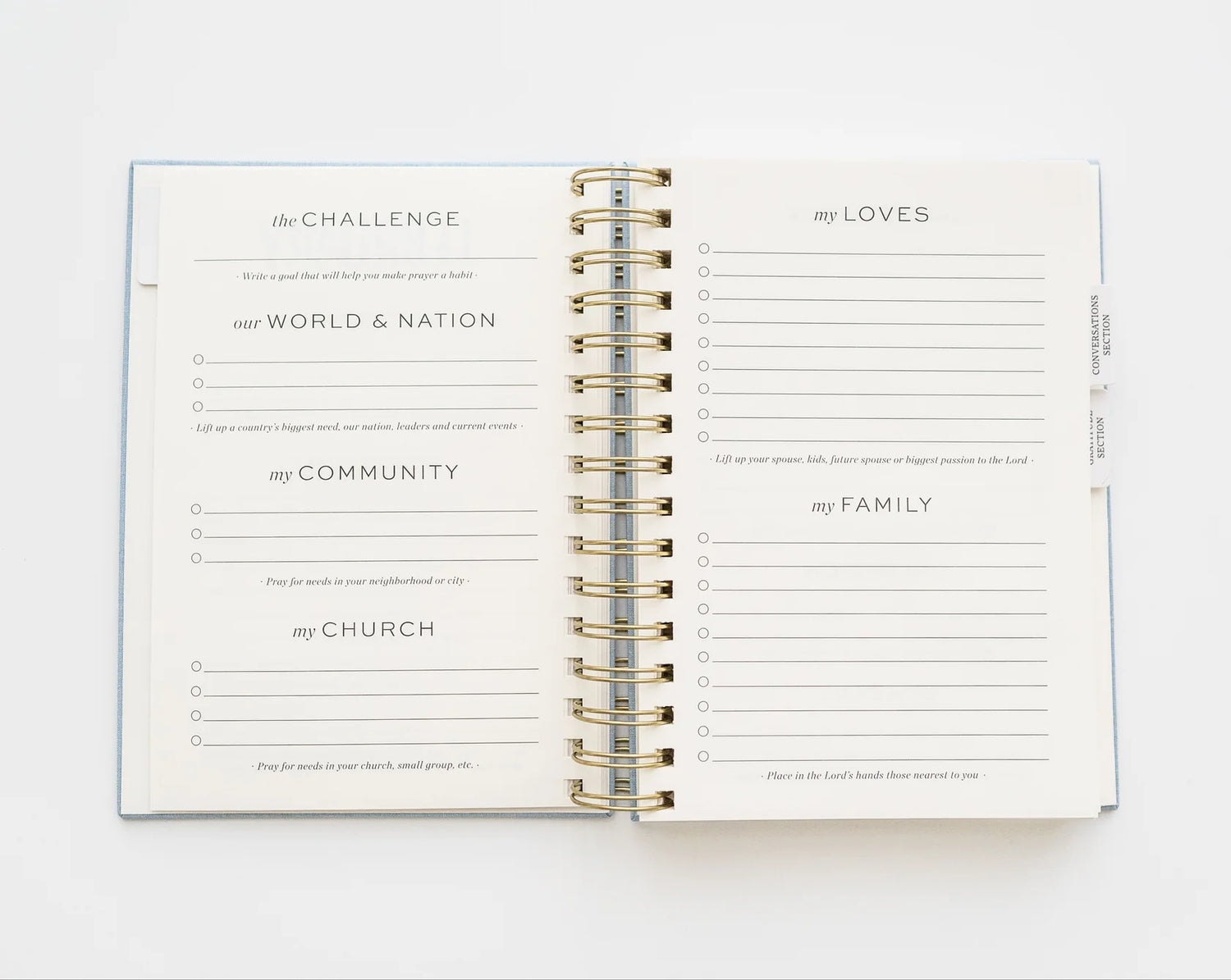 - Conversation - On those days it's especially hard to concentrate or you want to recall more details about an answered prayer, flip to this lined section and find lined pages to jot down prayers. There is enough space for 2-3 times per week throughout the year. If you desire more writing space, check our Signature Prayer Journal.